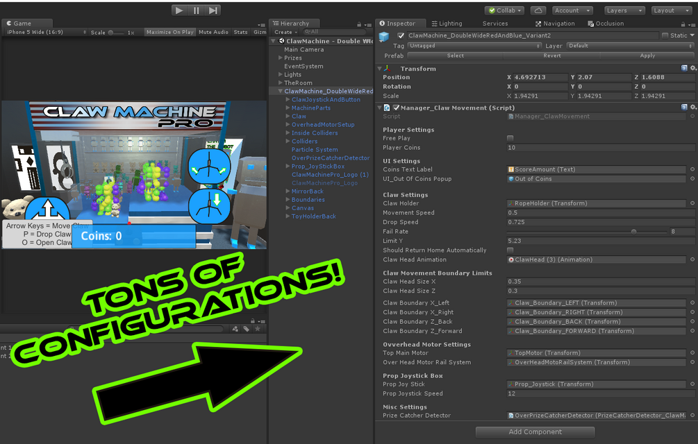 * Create an endless number of claw machines using the included prefabs, models, and parts!
